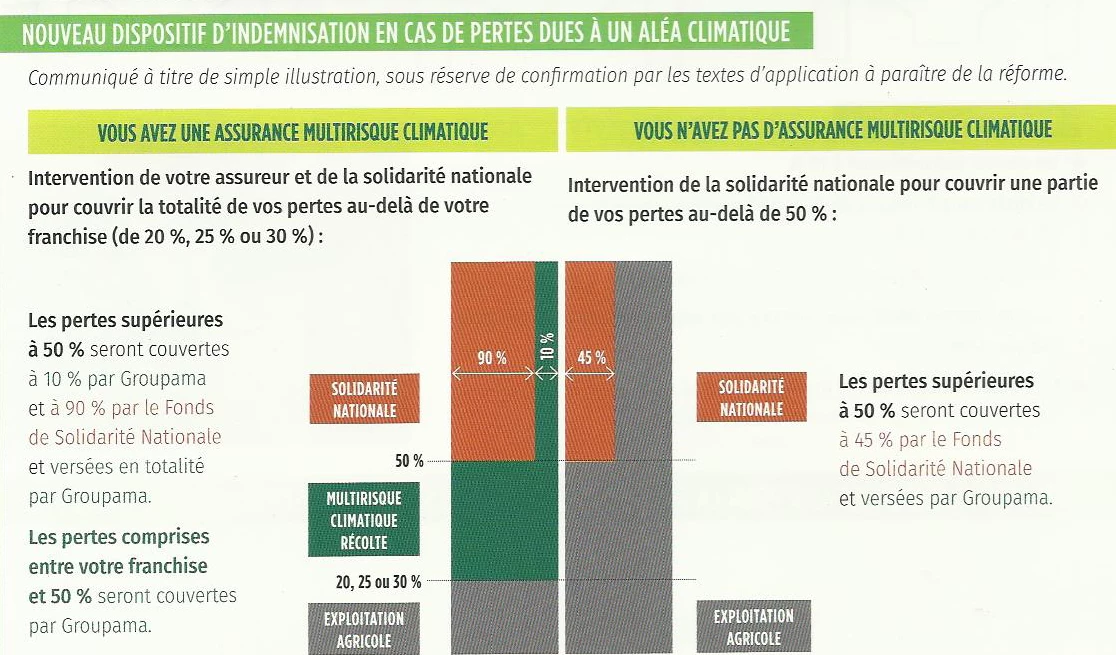 Les aléas courants, avec un niveau de perte inférieure à la franchise choisie, seront assumés par les agriculteurs. Les aléas significatifs, jusqu’à 50% de perte, seront pris en charge par l’assurance. En cas d’aléas extrêmes, les pertes supérieures à 50% seront prises en charge par le fonds de solidarité. Elles seront couvertes à 90% par le FSN et 10% par l’assureur si l’exploitant est assuré. S’il ne l’est pas, le FSN ne couvrira que 45% des pertes au-delà de 50%.