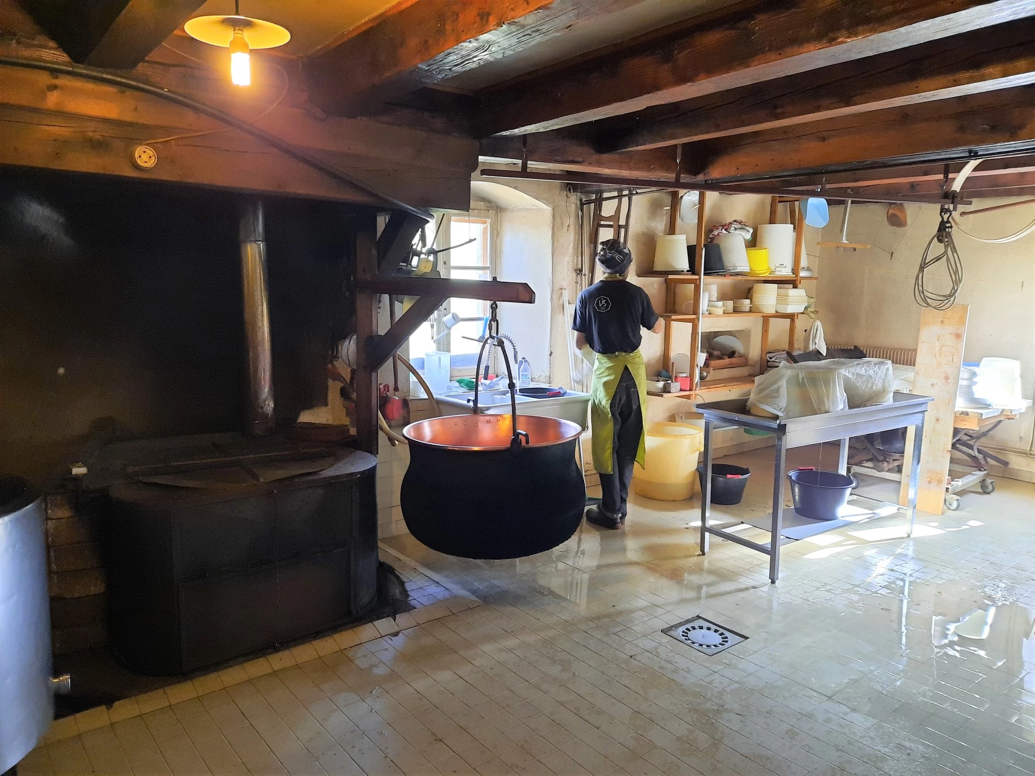 La particularité de la ferme est de travailler de manière traditionnelle avec cuisson au feu de bois dans un chaudron en cuivre de 250 l, soutirage à la toile, levage de la poche de caillé au palan et pressage du gruyère à la presse manuelle. Cf photo atelier de transfo