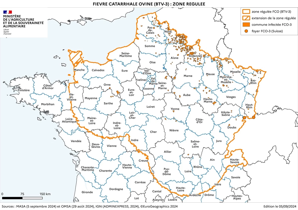 Depuis le 6 septembre 2024, la totalité du Jura se trouve en zone régulée suite à la confirmation de foyers de FCO BTV3 en Saône-et-Loire et dans le Doubs. Des foyers d’infection par le virus FCO BTV3 ont également été confirmés dans le Jura Suisse.