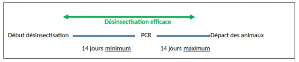 Pour pouvoir sortir de la ZR, les animaux d'espèces sensibles à la FCO doivent avoir fait l’objet d’un traitement de désinsectisation au moins pendant les 14 jours ayant précédé la date du mouvement, avoir obtenu un test de dépistage PCR négatif (prélèvements réalisés au moins 14 jours après le début de la désinsectisation), et les moyens de transport doivent être désinsectisés avant le chargement des animaux. Le départ des animaux (maintenus sous protection contre les vecteurs) de la ZR doit être effectué dans les 14 jours suivant le prélèvement sanguin.